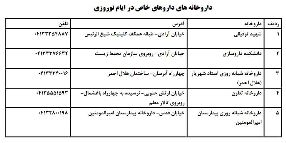 مطالب مفید ماه مبارک رمضان و تعطیلات نوروزی 1404 . توصيههاي دارويي و پیشگیری از مسمومیت ها در ارتباط با ايام نوروز (تعطيلات عيد) نکات پيشگيري از بروز مسموميت با شوینده_ها و ضدعفونی کنندههای خانگی دارو، نگهداری و معدوم سازی لیست داروخانه های شبانه روزی تبریز لیست داروخانه های شبانه روزی شهرستان کد خبر : 44748 کپی کلمات کلیدی : روزهاي ماه مبارك رمضان نوروز با تغذیه عید نوروز